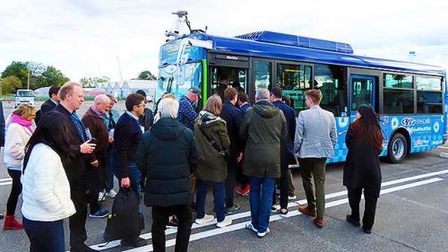 ドイツ・フランスなどの欧州圏、カナダ・アメリカなどの北米、アジア圏からの研究者・開発者など50人を超える一団が埼玉工業大学を訪れ、自動運転で運行している路線バス路線を含む一部区間に試乗し、「既存の路線バス車両に自動運転AIシステムを後付けするソリューション」を体感した。