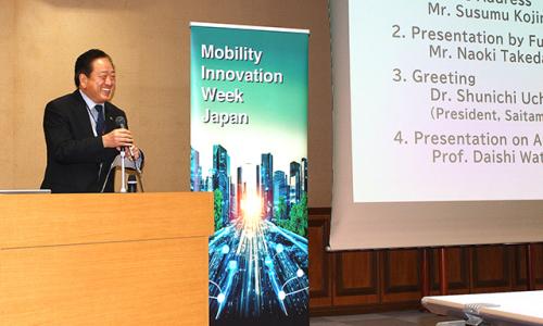 前半のレクチャーでは、深谷市 小島進 市長や、深谷市 武田直樹 都市整備部次長兼都市計画課長、埼玉工業大学 内山俊一 学長、埼玉工業大学 副学長(産学連携担当)自動運転技術開発センター長 渡部大志 教授らが登壇し、産官学連携で社会実装を推進する自動運転バスの現状とビジョンについて視察団に説明。