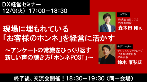 デジタルシフトウェーブは2025年12月9日、定例のセミナーを開催します。今回のテーマは「現場に埋もれている『お客様のホンネ』を経営に活かす~アンケートの常識をひっくり返す、新しい声の聴き方「ホンネPOST」~」。アンケートなどで収集した顧客の声を効果的に活用する仕組みを考えます。さらにセミナー後には登壇者を交えた交流会も開催します!