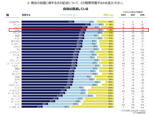 あなたは日本の未来に対してどう感じていますか?最新のイプソス調査によると、なんと70%の日本人が「自国は衰退している」と感じています。この驚くべき結果には、どのような背景があるのでしょうか?
