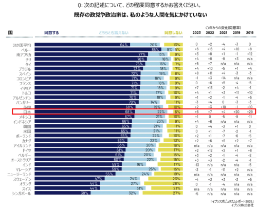 「既存の政党や政治家は、私のような人間を気にかけていない」と感じる日本人も68%に達し、こちらも約1.7倍に増加。このような状況は、現代社会の政治への期待感の低下を示唆しています。本来の役割を果たせていない政治への不満が、多くの国民の心に蓄積されていると言えます。