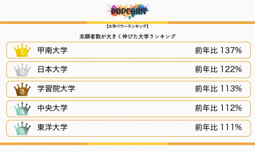 ポップコーン株式会社が運営するメディア「大学パワーランキング」は、2025年度入試における各私立大学の志願者数と2024年度志願者数の比較調査を行い、『2025年度入試 志願者数大幅増加大学ランキング』を公開しました。このランキングは、2025年2月〜3月に行われた各私立大学の情報を収集・集計し、志願者数の増加率によりランキング化されました。調査内容は、2025年度入試における各私立大学の志願者数と2024年度志願者数の比較です。
