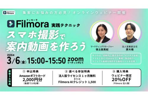 株式会社ワンダーシェアーソフトウェアは、動画編集ソフト『Filmora(フィモーラ)』を活用し、未経験からでも即実践できる動画制作ノウハウを伝える無料オンラインセミナーを、2026年3月6日15時より開催することを発表した。