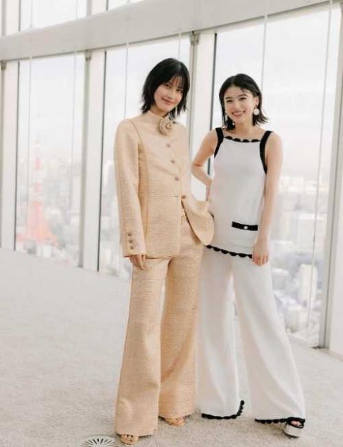 写真では、橋本がベージュのジャケットパンツスーツ、出口が白のセットアップを身にまとい、洗練された雰囲気の中に優しい笑顔を見せている。