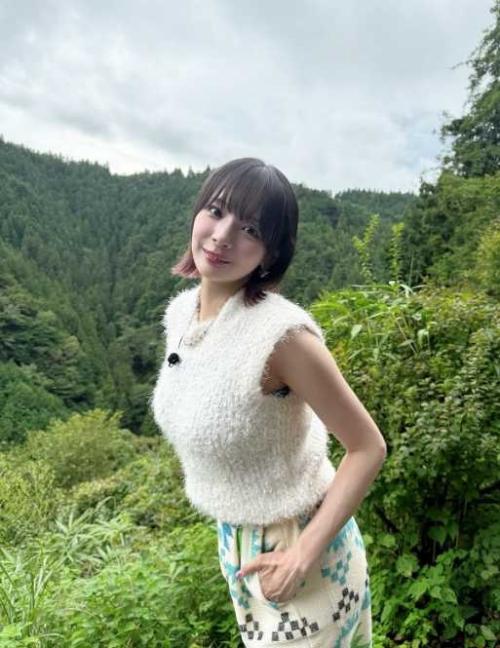 投稿に添えられた写真では、緑深い山々を背景に、白いふわふわとしたノースリーブのトップスと爽やかな柄スカートを合わせた岡田が登場。