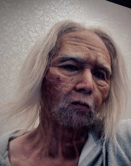白髪のロングヘアに深いしわ、やせた頬、リアルな老けメイクが施され、本人とは到底思えないほどの変貌ぶりだった。