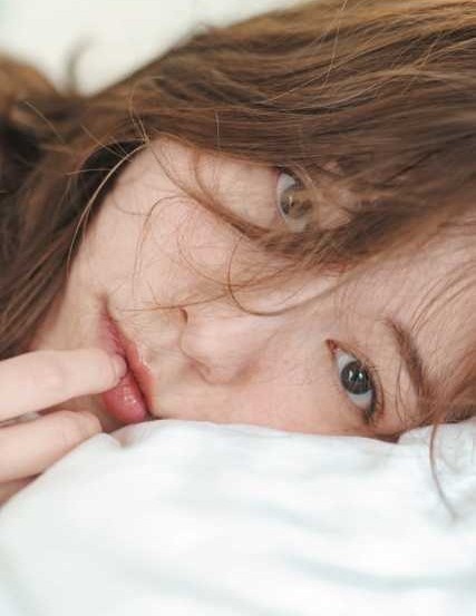 乱れた髪が頬にかかり、淡い光に包まれたその瞳はどこか儚く、ナチュラルな美しさと大人の艶っぽさが同居している。素肌の質感や柔らかな唇の描写も繊細で、見る者の心を引き込む一枚だ。