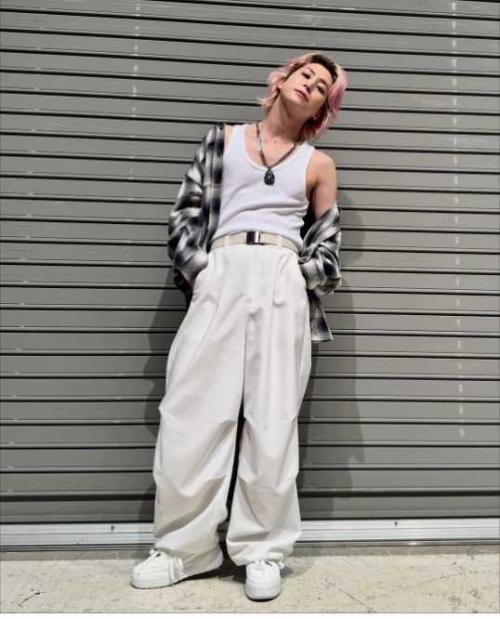 投稿された写真では、白のタンクトップに大き目のチェックのシャツを羽織り、ワイドなパンツを合わせ、ストリート感あふれるスタイリングを合わせ、まるで現代版キングが蘇ったかのようなオーラを放っている。