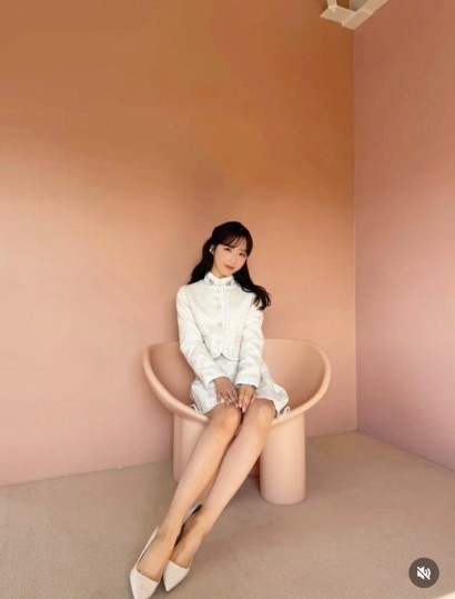 公開された写真では、ツイードジャケットとミニスカートのセットアップに白のパンプスを合わせたオールホワイトコーデを披露している。