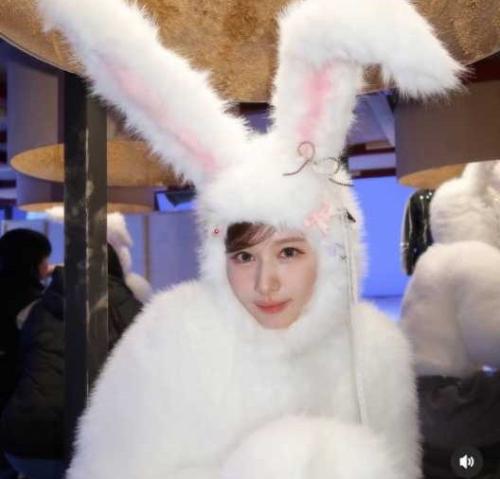 公開された写真では白くふわふわしたうさぎの着ぐるみ姿のサナがカメラを見つめており長いうさぎの耳が印象的だ。