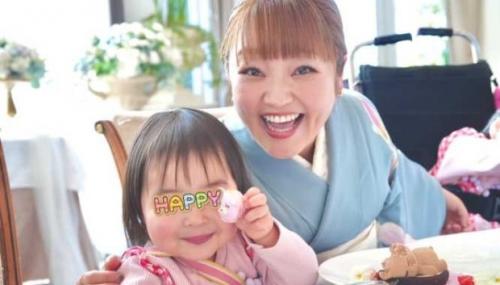 写真には、和装姿で満面の笑顔を見せる柳原と、隣で寄り添う幼い子どもの姿が収められている。
