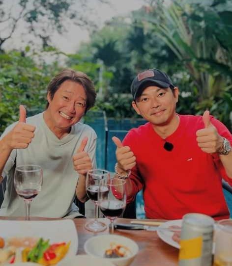 写真には、レストランのテーブルを前に、ワインを片手に親指を立てて笑顔を見せる2人の姿が収められている。