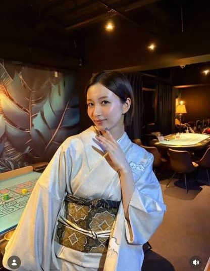 添付された写真には、落ち着いた空間で淡い色合いの着物に身を包み、指先を顎に添えて微笑む岡崎紗絵の姿が写されている。