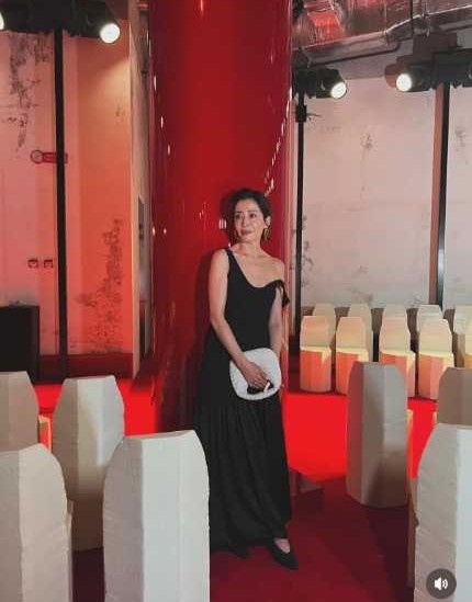 大胆な赤い円柱と幾何学的なオブジェが並ぶ空間の中、シンプルながら洗練されたドレスと白いクラッチバッグが映え、52歳とは思えぬ凛とした存在感を放つ。