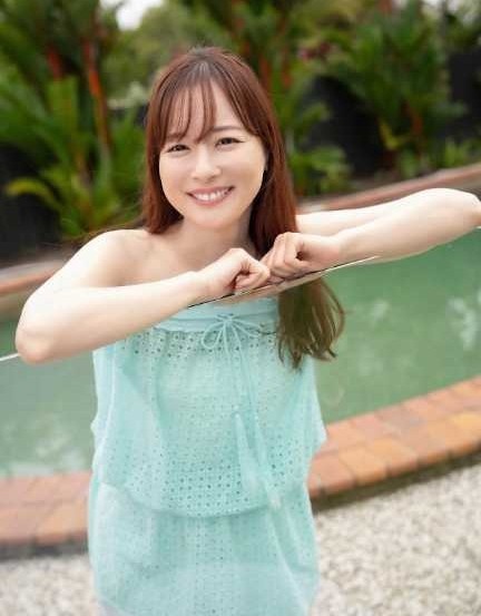 公開された写真では、緑豊かな植物に囲まれたプールサイドで、ミントグリーンのノースリーブワンピースをまとった皆藤愛子が笑顔を見せている。