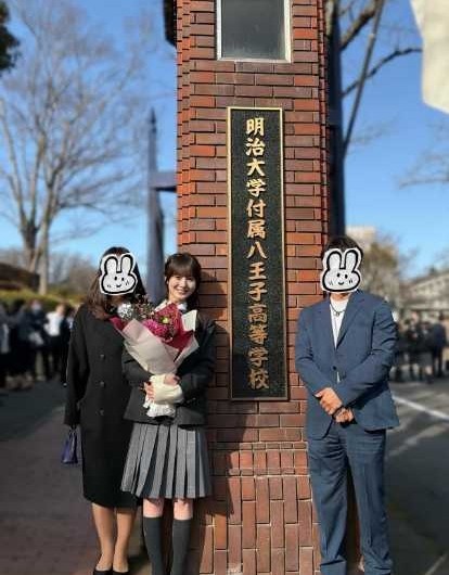 添付された写真では、明治大学付属八王子高等学校の校門前で花束を抱え、両親と並んで立つ本田紗来の姿が写っている。