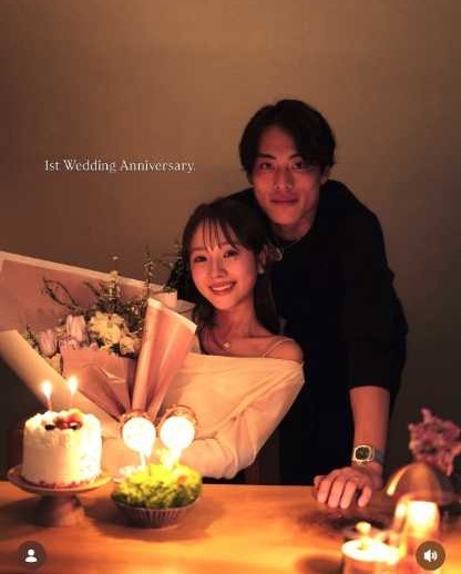 投稿された写真には「1stWeddingAnniversary」の文字が添えられ、キャンドルの灯りに包まれたロマンチックな空間で寄り添う2人の姿が写し出されている。前田は花束を抱え、オフショルダーのトップス姿で柔らかな笑顔を見せる。隣には黒のトップスを着た渡邊が立ち、穏やかな表情でカメラを見つめている。テーブルにはケーキやキャンドルが並び、温もりあふれる雰囲気が印象的だ。