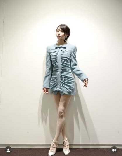 投稿に添えられた写真では、淡いブルーのミニワンピースを着用し、シンプルな背景の前で佇む姿を披露している。体にフィットしたデザインが特徴的で、ギャザーの入ったシルエットが個性的な存在感を放つ一着だ。すらりと伸びた脚と洗練されたスタイリングが際立ち、あのらしい独特の世界観を感じさせるビジュアルとなっている。