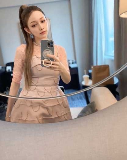 体にフィットしたデザインがスタイルの良さを際立たせ、柔らかな色合いと繊細な装飾が上品な印象を与える一枚だ。