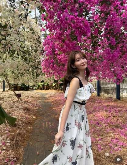 投稿された写真では、ピンクと白のブーゲンビリアが咲き誇る小道に立ち、軽やかに振り返る姿が印象的だ。