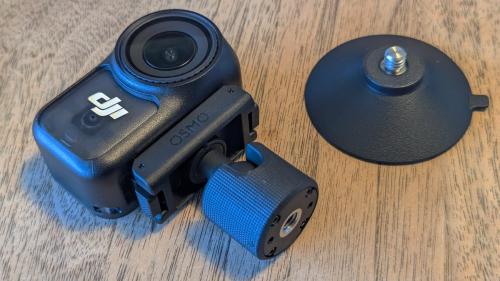 底面はマグネット式クイックリリースマウントに対応し、Osmo Actionシリーズのアクセサリーと互換性があります。製品のパッケージには「Osmo Nano 両方向磁気ボールジョイント アダプターマウント」を同梱。吸盤でテーブルや壁に固定するマウントとして使える他、吸盤を外すと1/4ネジ穴で一般的な三脚などさまざまなアクセサリーを取り付けられます。