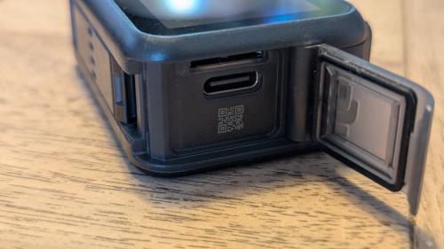 側面のカバーを開けるとUSB-CポートとmicroSDカードスロットにアクセスでき、USB-Cポートから充電ができます。カメラ本体は、多機能ビジョンドックを介して充電する仕様。ビジョンドックに内蔵するバッテリーにより、カメラ本体のバッテリーを20分で80%まで急速充電できます。多機能ビジョンドックに接続してフル充電の状態で、1080p24fpsの画質で最大200分の動画が撮影可能。