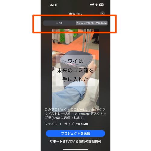 一番右上の、なんか“上に飛び出す”感じのアイコン押したら、ムービー(ビデオ)書き出せそうなダイアログになった。ビデオだけじゃなく、となりに「Premiere デスクトップ版(Beta)」ってのもある。もしかして、プロジェクトファイルも出せるの?マジか。