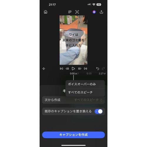 「キャプションを作成」を押してほどなく、新しいクリップが登場した。ちゃんと字幕になってる! ただ、さっき喋った内容がモゴモゴしてたせいか、途中は省略されていたので、キャプションの自動作成を使うなら、そのつもりでしゃべったほうが良いかもしれない。だから今回は“戻れ”っぽいやつを押して戻した。