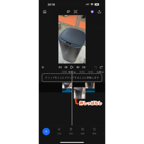 でもこれ、レイヤーというか上下に分けたいときはどうしたらええんじゃい、と思った時、「もしかして」と思って一つの動画を長押ししてみたら……なんか出てきた!
