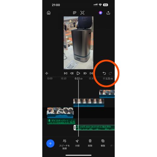 試しに、お菓子を食べる動画を開いてみたら、予想通り、音声クリップがビヨーンと出てきた。聞いてみるとハイテクゴミ箱に合わせてお菓子の包み紙のガサガサばかり聞こえてくる。今回は要らない。あ……、こういう時、PCだったらCtrl+Zでアンドゥしてたけど、これだとどれよ……。