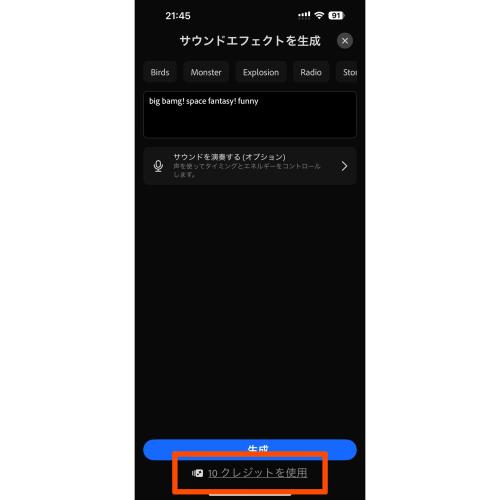 「生成」……の前に、下を見たら「10クレジットを使用」とある。ちょっと調べてみたら、どうやら、サービスによってはこのクレジットが必要になり、消費されていくみたい。なるほど、基本無料だけど、こういうリッチな機能を使うとクレジット分の追加購入とかが必要になる場合もあるわけね。理解してきた。