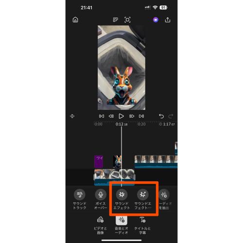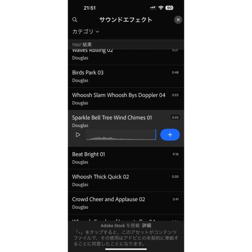 「サウンドエフェクト」だけの方を選んでみると、いろんな名前が並ぶ。もしかしてこれ全部、サウンド?そういうことか?!環境音っぽいのとか、SEぽいのとかいろいろある。ChimesってSEを選んで入れてみよう。