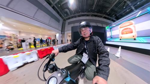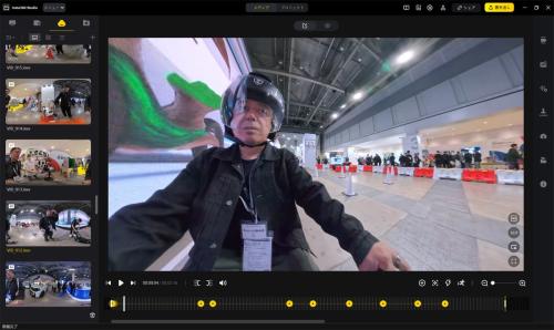 アクションカメラらしく、車載動画の撮影にも挑戦。「Tokyo Future Tour 2035」エリアにroidztechが出展していた3輪プラットフォーム型モビリティ「Raptor」に試乗する際、展示スタッフさんにご協力いただき、ハンドルに自撮り棒をテープで固定した状態で走らせてもらいました。撮影した動画は、デスクトップアプリ「Insta360 Studio」で編集。タイムラインにキーフレームを挿入して、マウスをドラッグしながら視点やズームを決定し、自由に視点を移動する動画が制作できます。