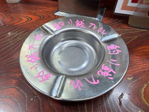 注文のしかたはちょっと独特で、まずは目の前に置かれた釣り銭入れ(灰皿)に軍資金を置きます。そして注文をするとお釣りがここに戻されるというシステム。