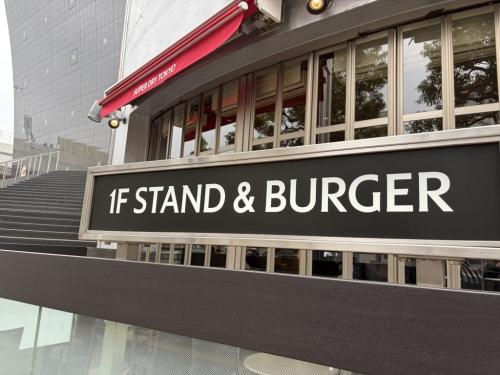 1階の「STAND&BURGER」フロアは、バーカウンターやオープンテラスを備えた開放的な空間。キンキンに冷えた「スーパードライ」やハンバーガーなどのフードメニューが並びます。