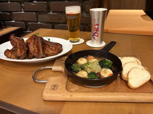 アヒージョやスペアリブなど、ビールに合う料理がそろい、キンキンに冷えた一杯との相性は抜群。