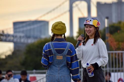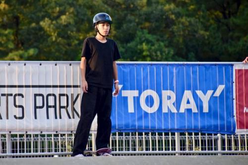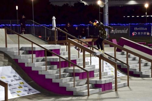 将軍レール以外全てのトリックが回し技、そして驚愕なのが3本ともノーミス(3本合わせて135秒間、超高難度のトリックを24回)という驚異の滑りを見せ、佐々木音憧に次ぐ2位でベストトリックに進む。