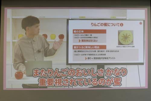 果物愛好家で“りんごマニア”のはたんきょー氏は、ビデオレターで出演。りんごの蜜について、はたんきょー氏は、「蜜はソルビトールという糖の一種で構成されています。ソルビトールは砂糖の6割ほどの甘さで、蜜自体は甘くありません。蜜には香り成分が多く含まれており、ソルビトールには食べた時に周りの熱を奪う吸熱反応があるので、独特の爽快感があります。これらが合わさり、りんごの甘みを引き立たせています」と語った。