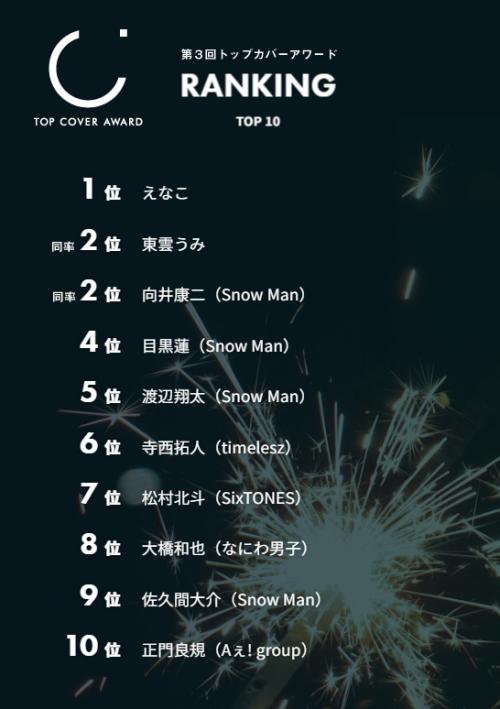 同アワードのTOP10では、1位のえなこのほか、東雲うみ、向井康二、目黒蓮、渡辺翔太、寺西拓人、松村北斗、大橋和也、佐久間大介、正門良規らがランクイン。えなこと東雲を除く上位は、男性アイドルの躍進が目立つ結果となりました。