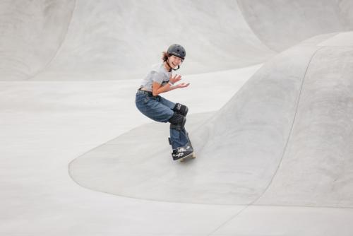 ロールインから勢いよくコースに入ると、高さのあるキックフリップインディからフロントサイドオーリーでトランスファーテールバッシュ。