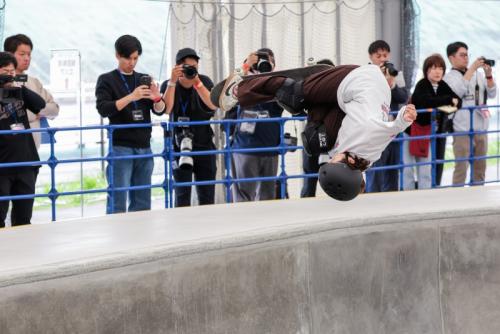1本目のランからフロントサイドキックフリップ メロングラブやキックフリップインディ、独特な大技バックフリップ(後方宙返り)などを決めると、87.96点を獲得。