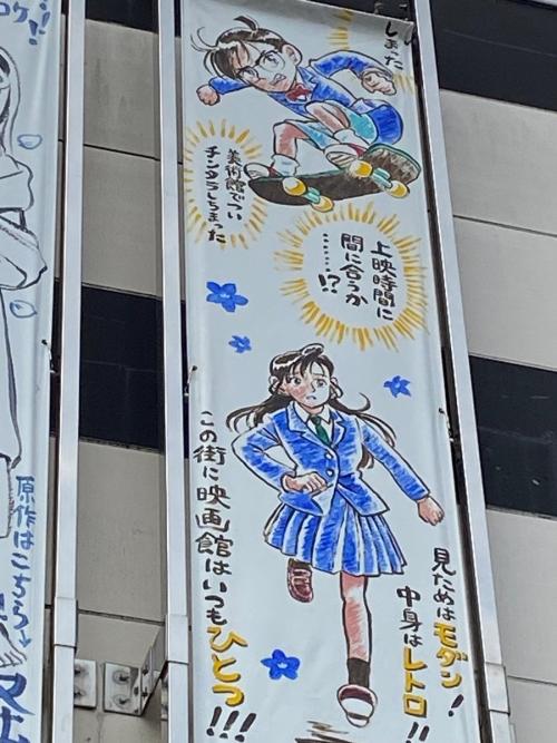 垂れ幕にはスケボーで疾走するコナンと「上映時間に間に合うか…!?」のセリフ、制服姿の蘭と「見た目はモダン!中身はレトロ!!この街に映画館はいつもひとつ!!!」の文字が手書きで描かれています。