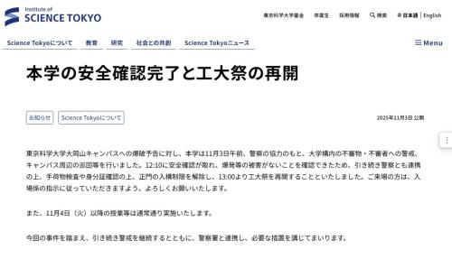 公式HPでは「東京科学大学に対して、11月3日に大岡山キャンパスを爆破する旨の予告がありました」とし「11月2日(日)19:00現在、警察と緊密に連携し、事実関係の確認および安全確保に向けた対応を進めております。本学では、キャンパスへ入構予定の皆様、学生、教職員の安全を最優先に考え、安全が確認できるまでの間、大岡山キャンパスへの立ち入りを制限することにいたしました」と発表した。
