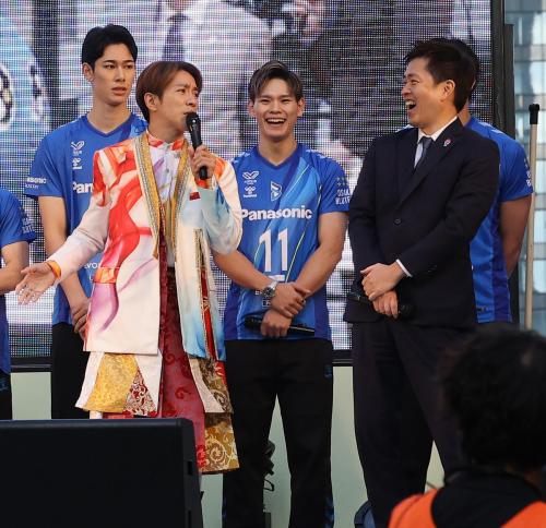 一方、横山裕は「25年前は原チャリで走ってた。今日はこんな立派な車を用意してくれて。村上がしゃべってたら、選挙出てるみたいで。将来の姿がかすみました」とニヤリ。MCの今田耕司も「知事としゃべってるから維新から出るんかな?」と乗っかり、村上は「まだ」とけむにまいた。