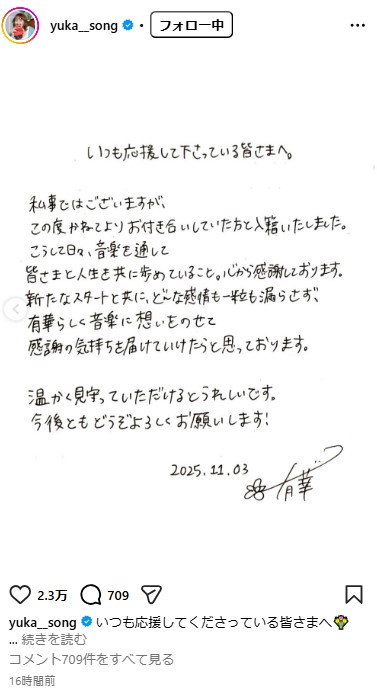 有華は自筆の文書をアップし、「私事ではございますがこの度かねてよりお付き合いしていた方と入籍いたしました」と報告。「こうして日々、音楽を通して皆さまと人生を共に歩めていること。心から感謝しています。新たなスタートと共に、どんな感情も一粒も漏らさず有華らしく、音楽に想いをのせて感謝の気持ちを届けていけたらと思っております」とつづり、「温かく見守っていただけるとうれしいです。今後ともどうぞよろしくお願いします!」と呼びかけた。