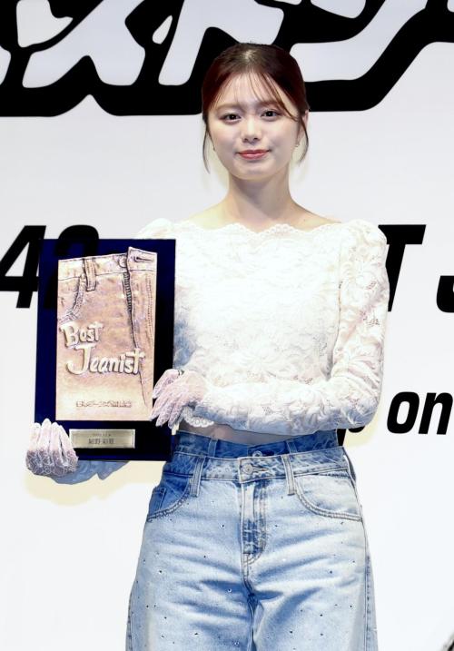 スタッツがついた薄色のデニムの下に、もう1枚重ねばきして登壇。盾を受け取り、「ほぼ毎日はいているジーンズの栄えある賞をいただけて、すごくうれしいです」と大喜び。続けて「毎日はいていても飽きない、成長していくジーンズのように、成長して、飽きられないようにお仕事をしていきたい」と語った。