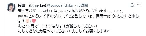 「終わった」と記したポストが「いいね」が1万以上を記録するなどX上で話題となったことを受け、園田は8日夜に「夢の万バザー0になれてうれしいですありがとうございます」などと投稿した。「my favというアイドルグループで活動している、園田一花(いちか)と申します」とあらためて自己紹介し、「あと2カ月でニートになりますが推してください!」と切実に訴えた。さらに「そしてどなたか雇ってください!よろしくお願いします」とハートマークを添えてアピールした。