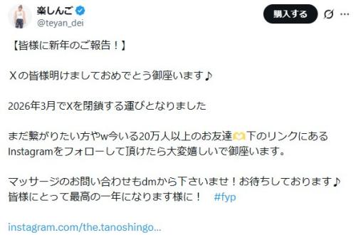 しんごは7日の更新で「【皆様に新年のご報告!】Xの皆様明けましておめでとう御座います」と書き出し、「2026年3月でXを閉鎖する運びとなりました」と記した。