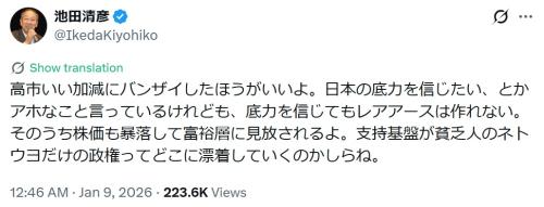 池田氏は、当初から高市氏の台湾有事発言を批判してきたが、悪化の一途をたどる日中関係の現状を受け「高市いい加減にバンザイしたほうがいいよ」とあらためて提言。「日本の底力を信じたい、とかアホなこと言っているけれども、底力を信じてもレアアースは作れない。そのうち株価も暴落して富裕層に見放されるよ」と私見を述べ、「支持基盤が貧乏人のネトウヨだけの政権ってどこに漂着していくのかしらね」と案じた。