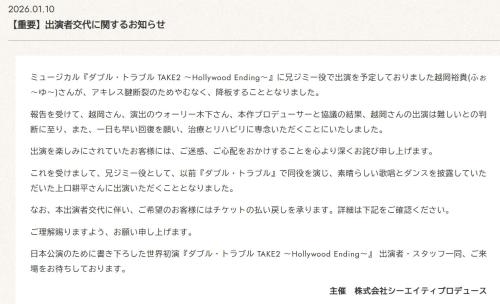 ミュージカル「ダブル・トラブルTAKE2~Hollywood Ending~」の公式X(旧ツイッター)がこの日、更新され、「重要/必ずご確認ください」とのタイトルで、同ミュージカルについて「出演者交代に関するお知らせ」を伝えた。